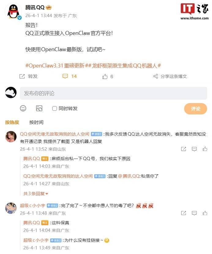 IT之家 4 月 1 日消息,腾讯 QQ 官方微博今日宣布,QQ 正式原生接入 OpenClaw 官方平台。